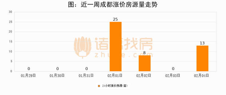 根据诸葛找房数据显示,成都24小时涨价房源量为13套,较02月03日增加13套,环比上涨0%。与此同时,涨价房源占比小幅扩大,业主信心有所提升。