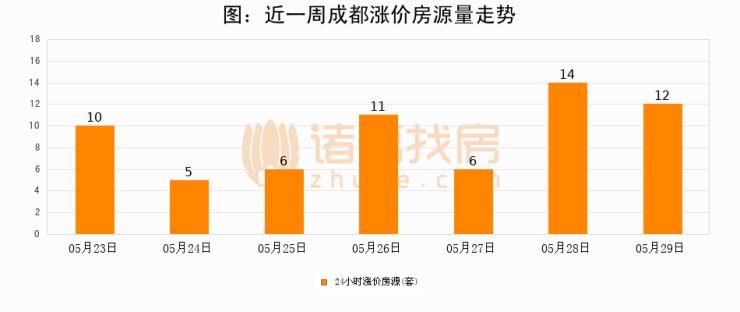 根据诸葛找房数据显示,成都24小时涨价房源量为12套,较05月28日减少2套,环比下降14.3%。与此同时,涨价房源占比小幅回落,对于购房者来说是一个入市窗口期,购房者可抓住时机入市。
