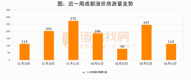 根据诸葛找房数据显示,成都24小时涨价房源量为114套,较08月03日减少133套,环比下降53.8%。与此同时,涨价房源占比小幅回落,对于购房者来说是一个入市窗口期,购房者可抓住时机入市。