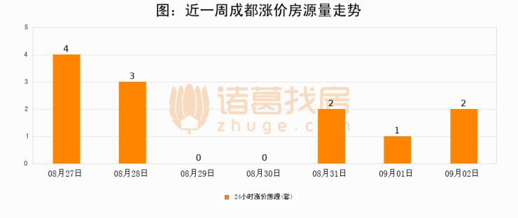 根据诸葛找房数据显示,成都24小时涨价房源量为2套,较09月01日增加1套,环比上涨100%。与此同时,涨价房源占比小幅扩大,业主信心有所提升。