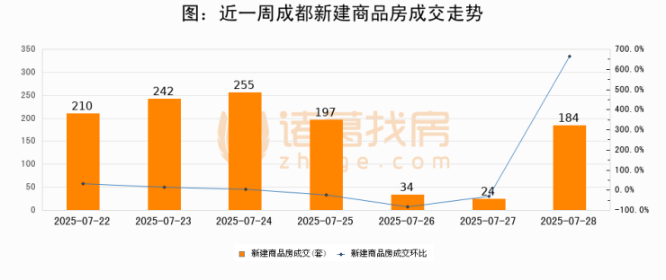 根据成都市住房和城乡建设局数据显示,2025年07月28日成都新建商品房成交184套,较昨日增加160套,环比上涨666.7%