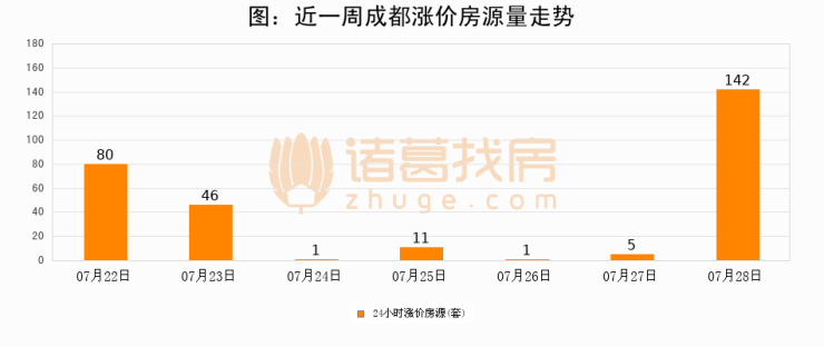 根据诸葛找房数据显示,成都24小时涨价房源量为142套,较07月27日增加137套,环比上涨2740%。与此同时,涨价房源占比小幅扩大,业主信心有所提升。