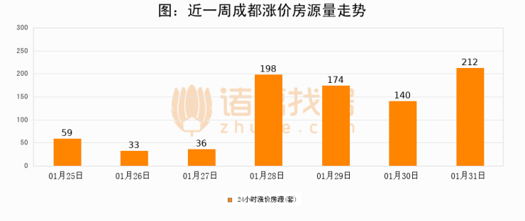 根据诸葛找房数据显示,成都24小时涨价房源量为212套,较01月30日增加72套,环比上涨51.4%。与此同时,涨价房源占比小幅扩大,业主信心有所提升。