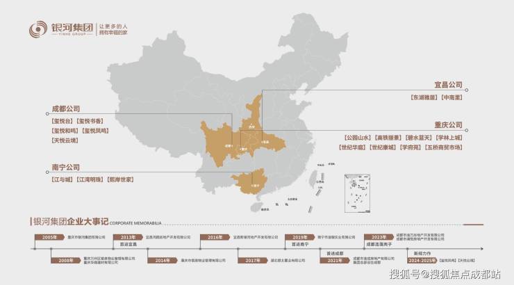 重庆银河集团创始于1985年,是一家历经41年发展沉淀的集团化公司,集“房地产开发、建筑施⼯、物业服务、商业贸易、商业运营”五⼤业务板块,全⾯开花。集团⽴⾜西南,呈现成都、重庆、南宁、宜昌多城市布局格局,⼗余盘、盘盘热销。