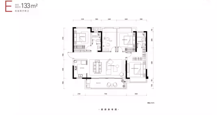 项目北向主力户型,12.1米超宽面宽实现双面采光。巧妙将次卫及书房置于次要位置,重点打造朝北一体化餐客厅与厨房,通过空间重组营造出130-140㎡的阔绰尺度感。