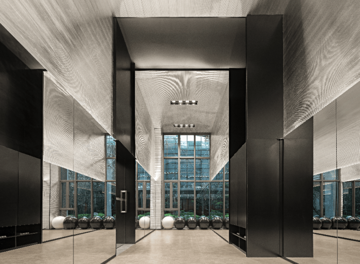 东侧和西侧的入户大门都是参照酒店的规制进行设计,西侧的大门设置有行车落客区,风雨飘板和约9m层高的社区大堂。高层楼栋通过风雨连廊串联,在雨天或天气曝晒的时候,业主回家可以不受恶劣天气干扰。风雨连廊在北上广的豪宅采用比较多,而成都目前还是比较少的。