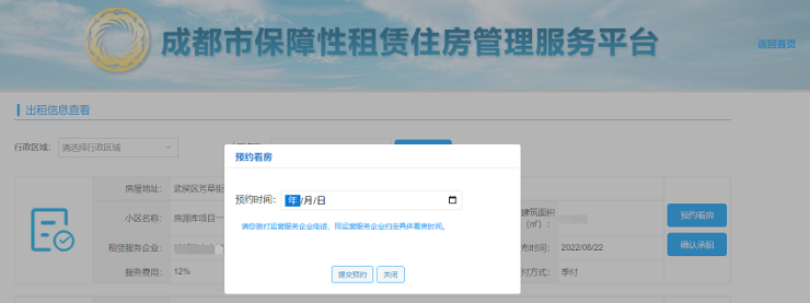 进入到我要租房界面后,若您已取得“保障性租赁住房天府租赁码”,可以点击“选择房源”查看已纳入保障性租赁住房的自有住房,选择一套租赁住房申请看房。运营服务企业收到看房申请后,将及时与您取得联系并协商看房时间及后续事宜。