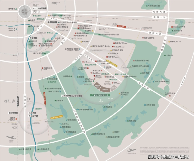 项目坐拥国家AAAA级景区三圣乡的万亩生态绿肺,同时享有"三华西"顶级医疗资源(华西医院锦江院区、华西附二院锦江院区、华西口腔锦江门诊)。地铁13号线(三圣花乡站)预计2025年底开通,9号线二期也已纳入远期规划,形成双地铁格局。教育配套方面,七中育才驸马校区(在建)、成师附小驸马校区(规划中)、成都三幼(规划中)等全龄段优质教育资源环伺。