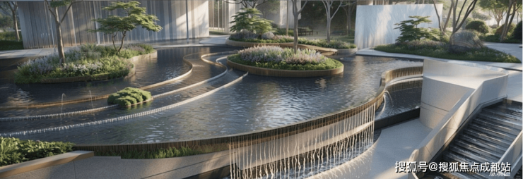 水流静静地落入下沉庭院,形成一道亮丽的风景,水景中央漂浮着三个船形树池,营造出"四水归一"的景致,以景观的方式诠释一帆风顺的美好寓意。