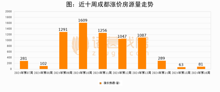 从调价房源来看,第15周成都涨价房源81套,较上周上涨28.6%。与此同时,15周涨价房源占比回落0.78个百分点,业主信心小幅波动,购房者可则需入市。