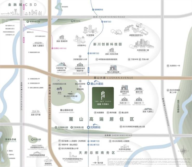 城南双极的居住核心位于麓山高端居住区,连接新川和天府中央商务区,吸引高新产业和天府新区商务客群,推动麓山成为城南居住的核心。