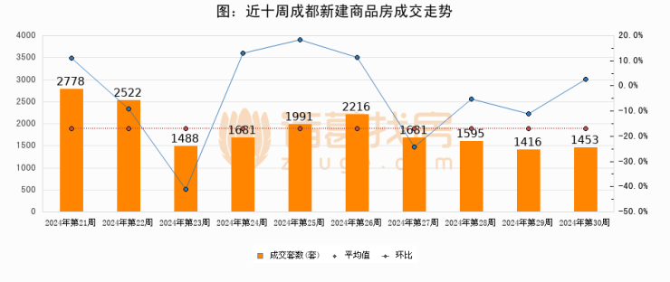 进入2024年第30周(07月22日-07月28日),成都新建商品房成交1453套,较上周增加37套,环比上涨2.6%