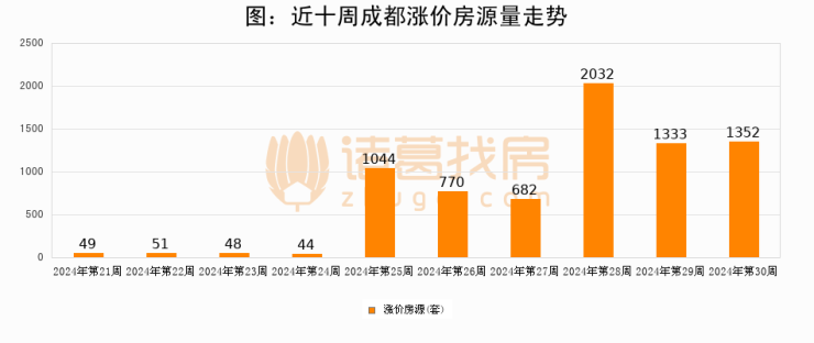 从调价房源来看,第30周成都涨价房源1352套,较上周上涨1.4%。与此同时,30周涨价房源占比回落0.55个百分点,业主信心小幅波动,购房者可则需入市。