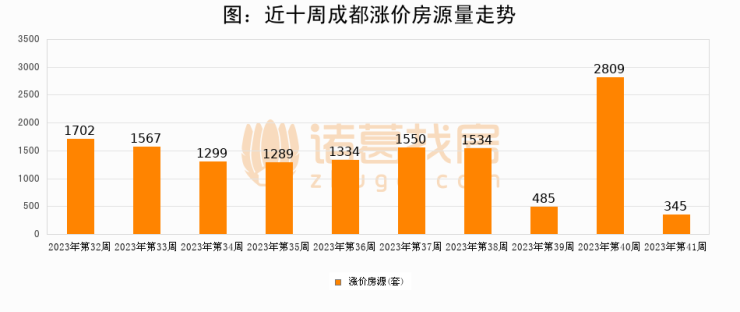 从调价房源来看,第41周成都涨价房源345套,较上周下降87.7%。与此同时,41周涨价房源占比回落6.27个百分点,业主信心小幅波动,购房者可则需入市。
