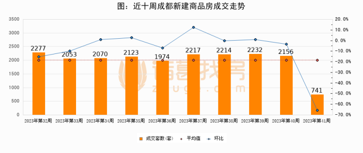 进入2023年第41周(10月02日-10月08日),成都新建商品房成交741套,较上周减少1415套,环比下降65.6%。从近十周成交来看,周均成交套数为2005套,本周成交741套,低于近十周平均成交量63%。