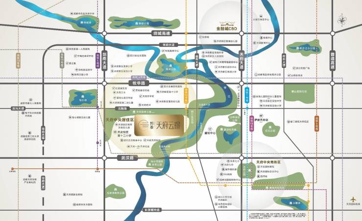 剑南大道黄金动脉 锦江生态带2.0:项目位于锦江生态带,是天新核心天府总部商务区内的纯粹高端住宅社区,位处剑南大道益州大道黄金动脉,上接金融城、大源,下接兴隆湖天西、科学城,同时两侧分别是怡兴湖及麓湖,占据城市核芯区位,是城市发展的重要节点。同时锦江生态带是天府新区配套最集中、最成熟、最具烟火气的板块,其几乎所有配套(商业学校医院公园等)都集中在2km范围内,这样的聚集度和呈现度在天府新区中首屈一指。