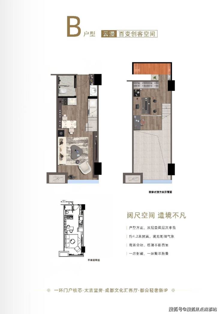 公寓产品:建面约35-42平,主力面积38平,层高4.2米,6T29户。标准loft公寓,单层面积1100平,可自由组合,随心搭配!
