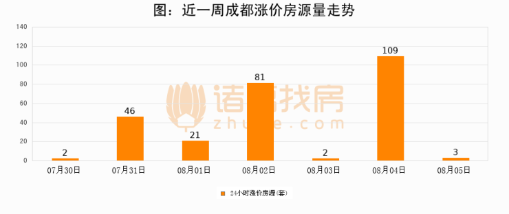 根据诸葛找房数据显示,成都24小时涨价房源量为3套,较08月04日减少106套,环比下降97.2%。与此同时,涨价房源占比小幅回落,对于购房者来说是一个入市窗口期,购房者可抓住时机入市。