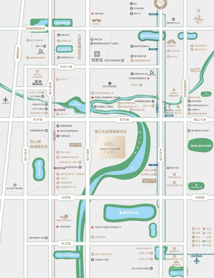 项目四面环湖,公园环绕(滨水公园、南湖湿地公园、红石公园、麓客岛、海昌极地海洋公园),绝佳的地理位置,占据最佳的生态资源,尽享公园城市生活。项目正门口即是约400米江景滨水公园绵延约20公里,北侧2.5公里的南湖湿地公园、南侧3.1公里的红石公园及麓客岛、东侧3.3公里的海昌极地海洋公园。据统计,锦江生态带板块内总生态体量近万亩,生态绿化保有量在整个成都版图上是排名第一且唯一的。