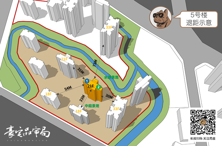 5号楼视野模拟分析 视野方面:5号楼正南看园区内庭,正北看干渠市政景观带及部分14号地园区内庭。南向退距只有约33米,主要朝向景观面相对欠缺,是5号楼弱于6号楼的决定性因素。