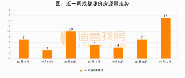 根据诸葛找房数据显示,成都24小时涨价房源量为15套,较02月16日增加8套,环比上涨114.3%。与此同时,涨价房源占比小幅扩大,业主信心有所提升。
