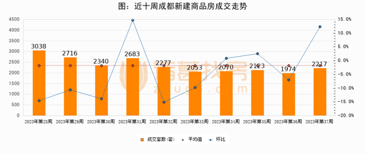 进入2023年第37周(09月04日-09月10日),成都新建商品房成交2217套,较上周增加243套,环比上涨12.3%。从近十周成交来看,周均成交套数为2349套,本周成交2217套,低于近十周平均成交量5.6%。