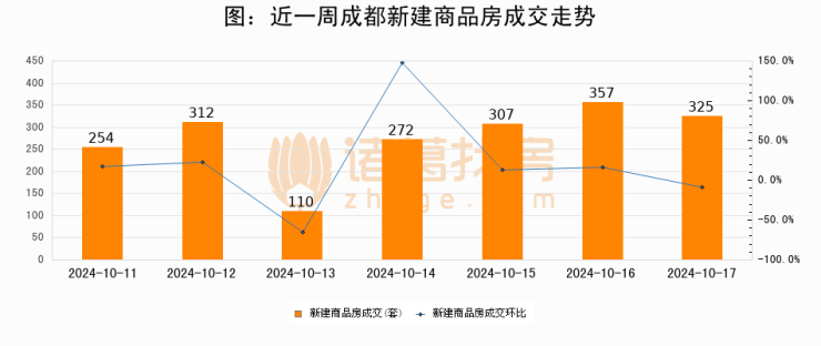 根据成都市住房和城乡建设局数据显示,2024年10月17日成都新建商品房成交325套,较昨日减少32套,环比下降9%
