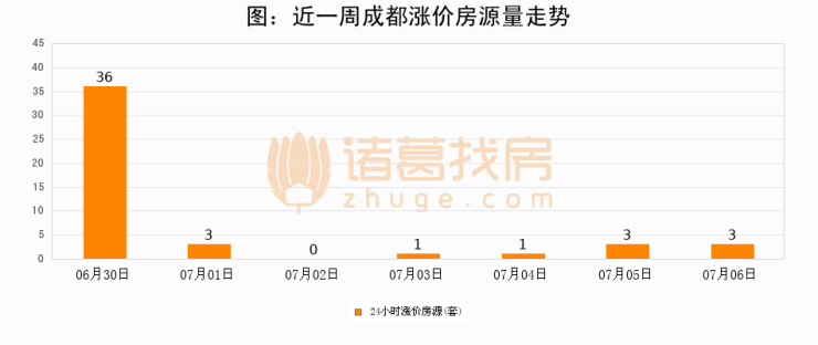 根据诸葛找房数据显示,成都24小时涨价房源量为3套,较07月05日持平。