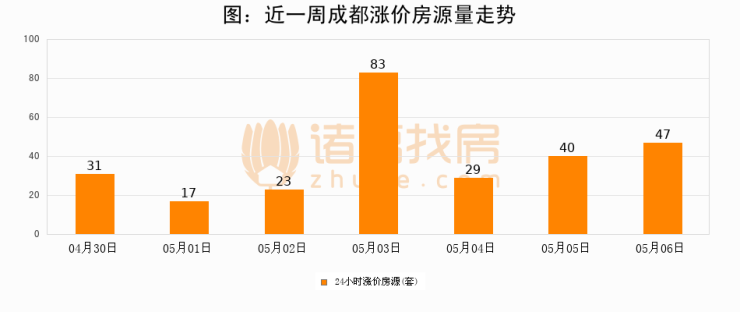根据诸葛找房数据显示,成都24小时涨价房源量为47套,较05月05日增加7套,环比上涨17.5%。与此同时,涨价房源占比小幅扩大,业主信心有所提升。