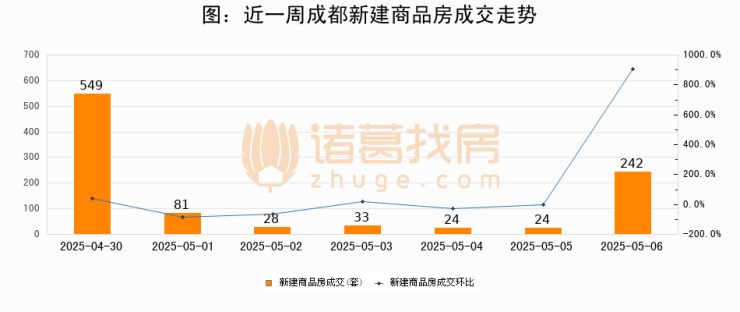 根据成都市住房和城乡建设局数据显示,2025年05月06日成都新建商品房成交242套,较昨日增加218套,环比上涨908.3%