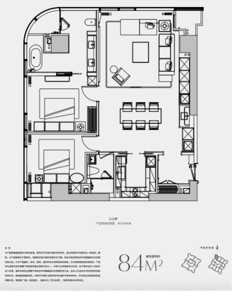 A1户型:84㎡/两室一厅一厨两卫A1户型坐落于建筑西北角的端户位置,其视野聚焦于城市核心的繁华景象与人文地标。主卧套房空间宽敞,绝佳视野主要集中于此,业主在浴缸中就能欣赏到城市的璀璨霓虹,浪漫情调十足。而且两个卧室均可俯瞰蜿蜒流淌的锦江,合江亭、安顺廊桥、九眼桥等城市地标尽收眼底。该户型室内设计灵感源于黄龙层叠的阶梯水系以及周边风景旖旎的森林秘境,以“艺术疗愈 - 东方伊甸园”为核心理念,精心打造出融合自然美学与人文关怀的居住空间,兼具治愈力与艺术感,仿佛能穿透城市的喧嚣。A户型:85㎡/两室一厅一厨两卫A户型位于建筑东南角的端户。从次卧到客厅、主卧,拥有270度的无柱端厅,超宽观景面不仅能饱览城市景观,还带来奢侈的“开阔视野”。客厅可对望攀成钢,主卧抬眼便能直面锦江和望江公园。室内设计汲取川西高原的雪山、草原及人文元素,运用温暖厚重的皮革、毛呢,搭配胡桃色原木等材质,营造出独具野性与温柔特质的都市游牧风。从城市中心到川西高原,传递出自然疗愈的能量。