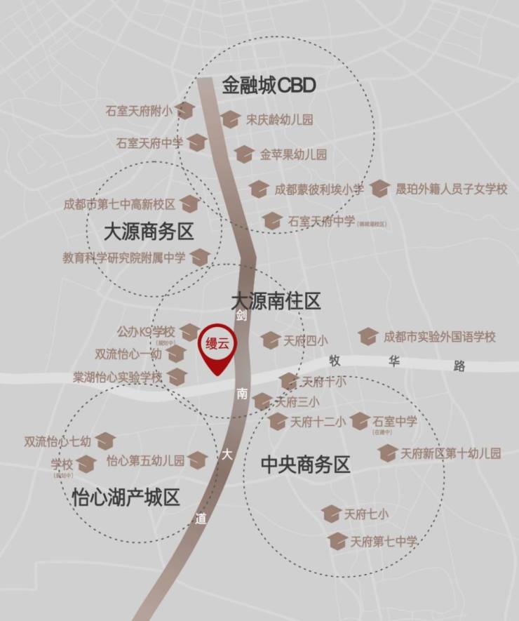 【区域优势凸显】建发华润缦云项目位于城南剑南大道与牧华路主干道交汇处,地处怡心湖以北片区,是城南改善中轴上的优质项目,尽享天府生活资源头排优势。【剑南大道——改善轴线】剑南大道以神仙树为起点,沿线分布着众多城南品质住区。神仙树、金融城CBD、锦城湖、大源商务区、大源南住区、锦江生态带、怡心湖产城区、浅水湾等成都知名的豪宅住区,都因剑南大道而串联起来,形成了一条独特的改善居住轴线。