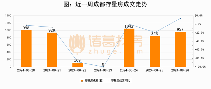 从存量房来看,2024年06月26日成都存量房单日成交957套,比昨日增加114套,环比上涨13.5%。从近一周存量房成交来看,成都存量房日均成交套数为696套,06月26日单日成交957套,高于近一周平均水平37.5%。
