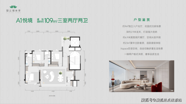 其中,建面约109㎡的悦境户型,堪称当代年轻家庭首选的刚改不二之选。其采用总高仅11层的一梯两户设计,每栋仅22户,确保了居住的私密性与纯粹性。户型内部,约8.9米奢阔观景阳台连接LDKG一体化横厅,不仅实现了空间的“零浪费”和近100%的得房率,更创造了一个开阔、互动的家庭社交中心。此外,约9㎡的私享电梯厅、海量收纳的玄关设计以及可根据家庭需求灵活改造的“X空间”,每一处细节都体现了对现代人居需求的深刻洞察,堪称同面积段产品中的革新之作。