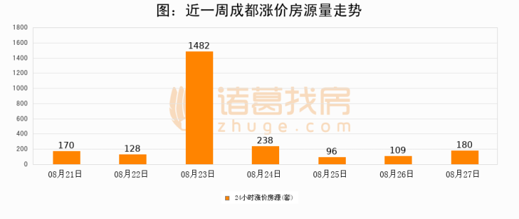 根据诸葛找房数据显示,成都24小时涨价房源量为180套,较08月26日增加71套,环比上涨65.1%。与此同时,涨价房源占比小幅扩大,业主信心有所提升。