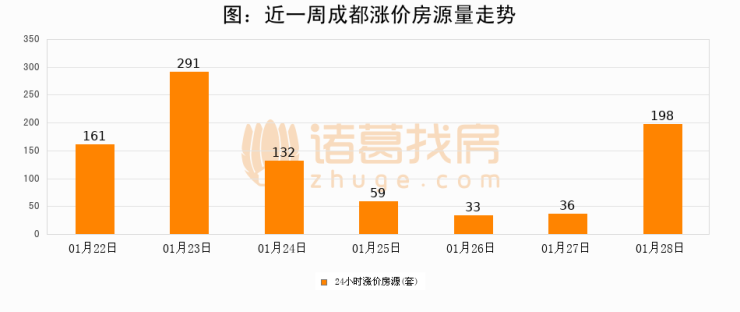 根据诸葛找房数据显示,成都24小时涨价房源量为198套,较01月27日增加162套,环比上涨450%。与此同时,涨价房源占比小幅扩大,业主信心有所提升。