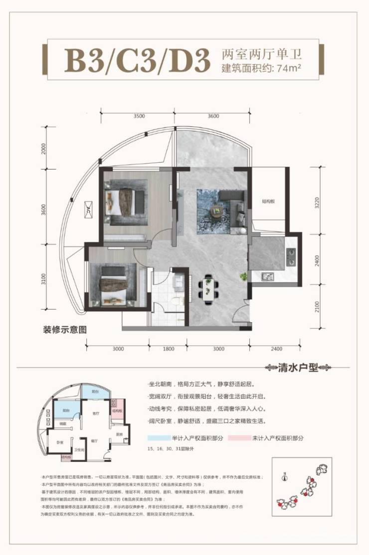 设计亮点:全明户型、高赠送(如阳台、飘窗)、3米层高及4.8米入户大堂提升居住品质。