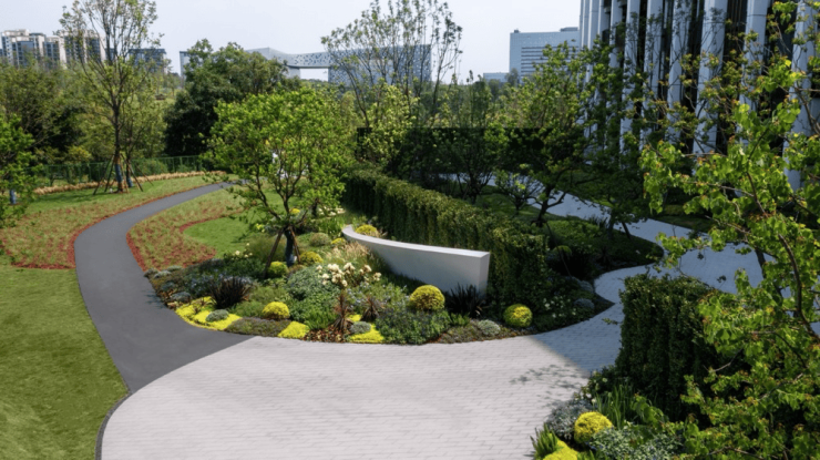 丹麦HL集团根据4栋住宅不同的地缘禀赋,打造森林、水景、砾石、花丛4大独立的主题中庭花园,并植入派对草坪、户外健身、游乐场地及社交聚会等空间,处处美景宛若时时度假。