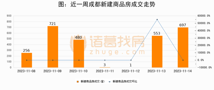 根据成都市住房和城乡建设局数据显示,2023年11月14日成都新建商品房成交697套,较昨日增加144套,环比上涨26%