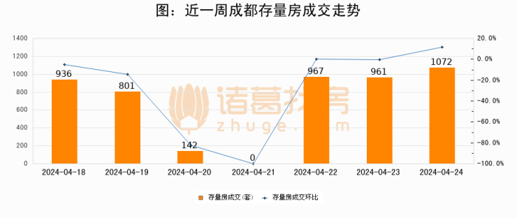 从存量房来看,2024年04月24日成都存量房单日成交1072套,比昨日增加111套,环比上涨11.6%。从近一周存量房成交来看,成都存量房日均成交套数为697套,04月24日单日成交1072套,高于近一周平均水平53.8%。