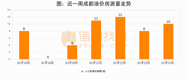 根据诸葛找房数据显示,成都24小时涨价房源量为10套,较04月23日增加2套,环比上涨25%。与此同时,涨价房源占比小幅扩大,业主信心有所提升。