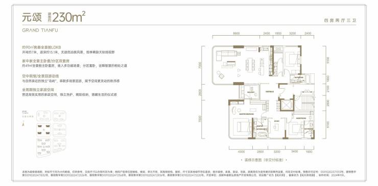 230㎡(端厅4室2厅3卫);单价:3.5-3.8万;总价:810-890万