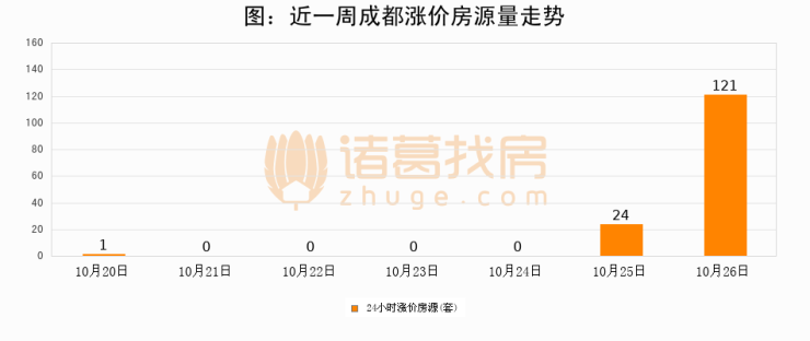 根据诸葛找房数据显示,成都24小时涨价房源量为121套,较10月25日增加97套,环比上涨404.2%。与此同时,涨价房源占比小幅扩大,业主信心有所提升。