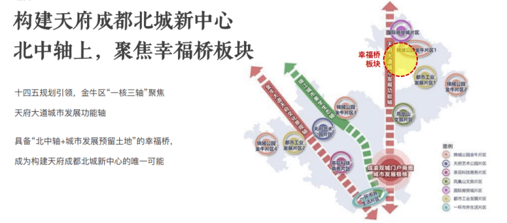 十四五规划引领,金牛区“一核三轴”聚焦天府轨道城市发展功能轴具备“北中轴+城市发展预留用地”的幸福桥,成为构建天府成都北城新中心的唯一可能。