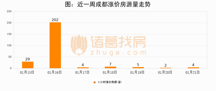 根据诸葛找房数据显示,成都24小时涨价房源量为4套,较01月20日增加2套,环比上涨100%。与此同时,涨价房源占比小幅扩大,业主信心有所提升。