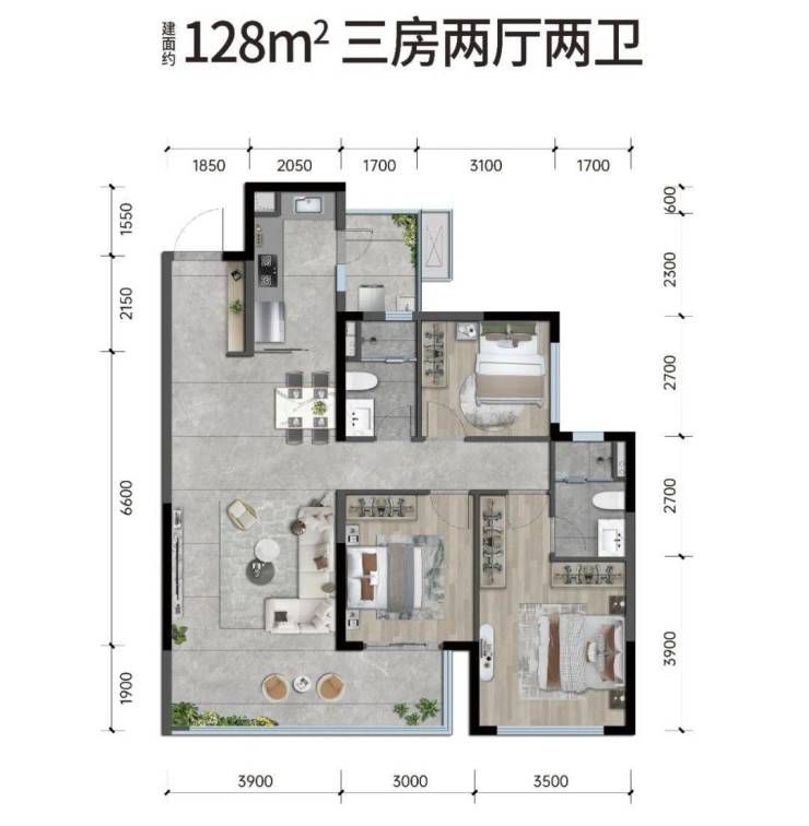 建面约128㎡大三房户型,约32㎡的大空间方正餐客厅,通透大气,客厅与6.8米开间的景观阳台相连,采光通风俱佳。此外,除了入口玄关的收纳柜,主卧的步入式衣帽间,厨房收纳外,还做了餐边柜以及卫浴收纳等,兼具美学与功能性。