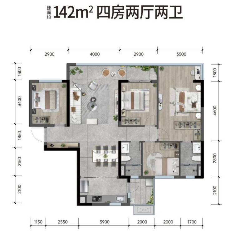 以龙湖·焕城天悦的建面约142㎡大四房户型为例,约35㎡的LDK一体化设计、约6.9m的巨幕阳台,居住体验值得期待;阔大四房设计、约27㎡主卧套房、南北通透,并设计超大步入式衣帽间和配置三件套的独立式卫生间,提升居住品质。