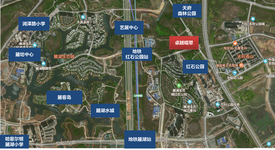 项目位于麓湖板块公园区,与红石公园仅隔着一条天津路,作为成都少有一个两次获得英国BALI国家景观奖的红石公园,在成都可谓家喻户晓,也是众多家庭周末亲子游的重要去处。与此同时,项目周边还有天府森林公园和麓湖公园等公园配套,生态资源较为优越。