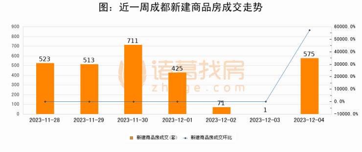 根据成都市住房和城乡建设局数据显示,2023年12月04日成都新建商品房成交575套,较昨日增加574套,环比上涨57400%