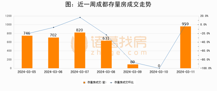 从存量房来看,2024年03月11日成都存量房单日成交959套,比昨日增加959套,环比上涨0%。从近一周存量房成交来看,成都存量房日均成交套数为563套,03月11日单日成交959套,高于近一周平均水平70.3%。